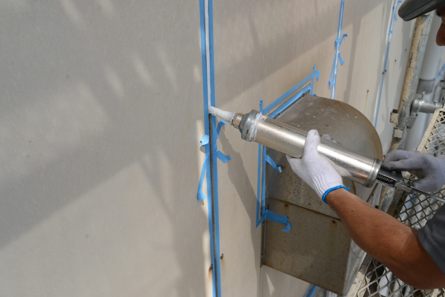 外壁材同士の目地を埋めるコーキング。こちらは隙間から雨水が入り込まないようにするための充填作業です。ゴム状で弾力に富んだ素材を目地に充填していきます。